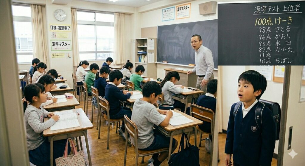 Y先生は、漢字テストの点数の上位7名ほどの名前を毎回の授業前に黒板に書いていました。