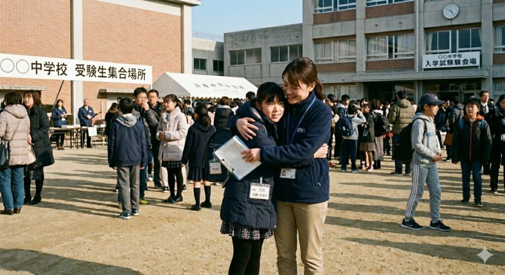 そして、洛南中学の受験当日、校庭の集合場所に向かったところK先生がいました。私が集合場所に着いた時、ギュッとK先生から抱きしめられました。