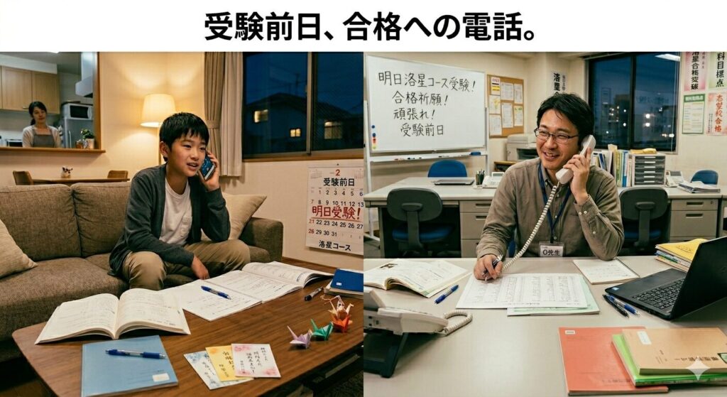 私の所属していた教室では受験の前日に、担当の各教科の先生が電話をかけてくれました。