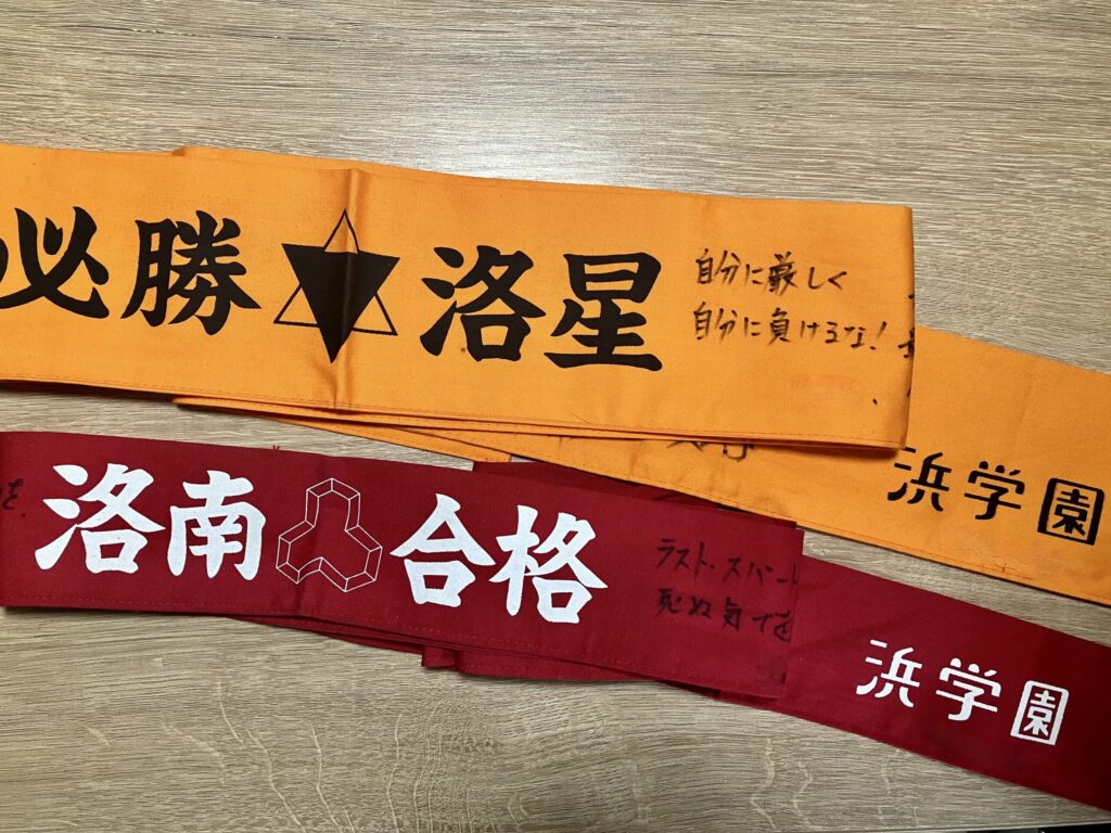 浜学園では志望校別のハチマキがあります。受験前の自習などではこのハチマキを締めて、気合いを入れて勉強をします。