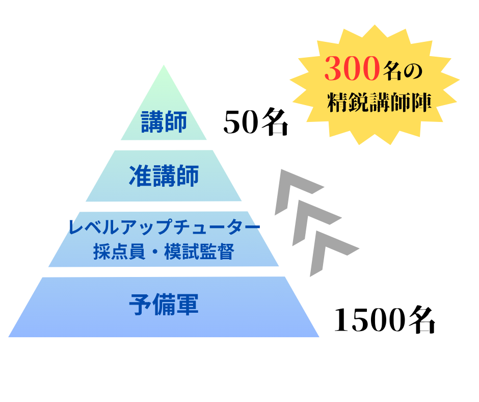 一流の講師を生みだすために、「講師三軍制」を採っています。採用テストに合格した段階が三軍、准講師(テスト実施業務)が二軍、厳しい研修課程を経て講師登用試験に合格した講師を一軍としています。