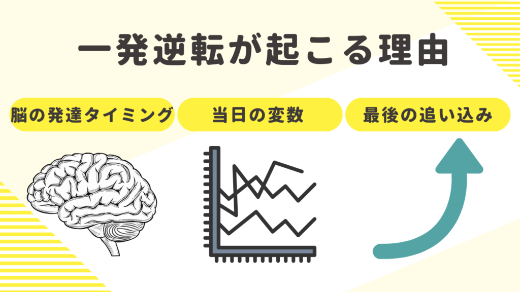 - 受験当日は予測できない変数が多く、誰にでも逆転のチャンスがある