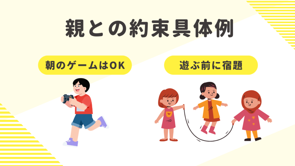 小学校低学年の勉強で最も重要なことは「宿題をすること」です。小学校の宿題を完璧にこなしましょう。宿題をする習慣を身につけるためには、親御さんとお子さんとの約束が効果的です。例えば以下のような約束をしてみてはいかがでしょうか。